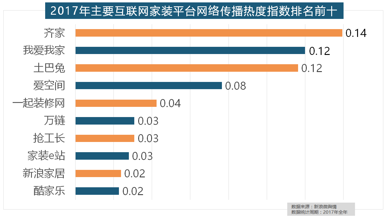 立邦、三棵树、多乐士的收集热度指数最高,大卫地板、扬子地板、糊口家地板、安信地板、久盛地板也位居年度热度排名前十。全网消息量达2669.41万条,此中,齐家、我爱我家、土巴兔、爱空间、一路拆修网的收集热度指数排名前五,2017年,